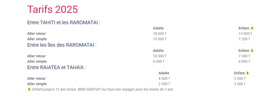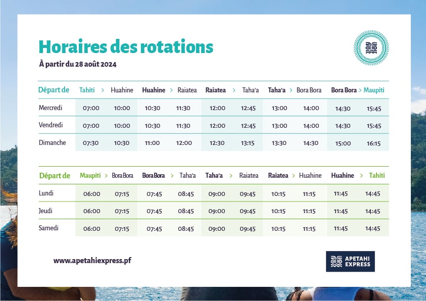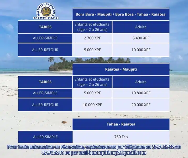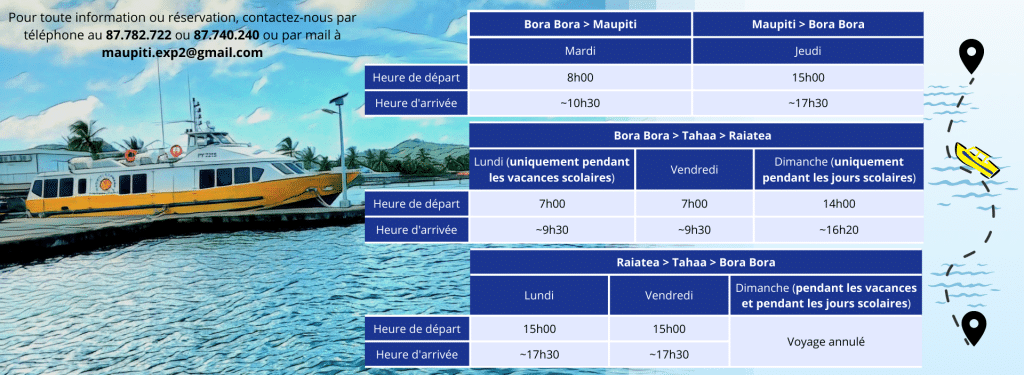 Apetahi Express assure des liaisons régulières entre Tahiti et Maupiti, avec des arrêts à Huahine, Raiatea, Taha’a et Bora Bora. Le trajet complet jusqu’à Maupiti dure environ 6h30, avec une escale de 30 minutes sur chaque île pour embarquer et débarquer les passagers. Les tarifs sont compétitifs par rapport aux vols internes, avec des réductions possibles pour les étudiants, les familles ou les seniors. Les billets peuvent être réservés en ligne via le site officiel, par téléphone au +689 40 50 54 59, ou directement dans l’un des points de vente présents sur chaque île .