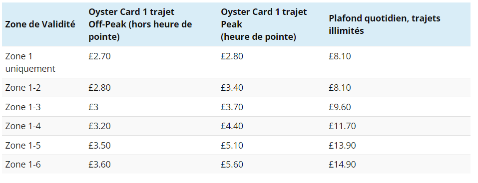 Avec ces cartes, un trajet en métro dans le centre de Londres (zones 1 et 2) coûte environ 2.70£ contre 6.70£ avec un ticket à l’unité.